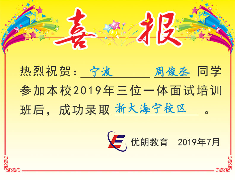 2019喜讯:宁波周俊丞同学成功录取浙大海宁校区 发布时间:2019-07-25 09:32:40 阅读量: 欢迎考生及家长扫码咨询,了解三位一体面试更多内容 咨询微信:swytms 三位一体公众号:sanweiyiti_org