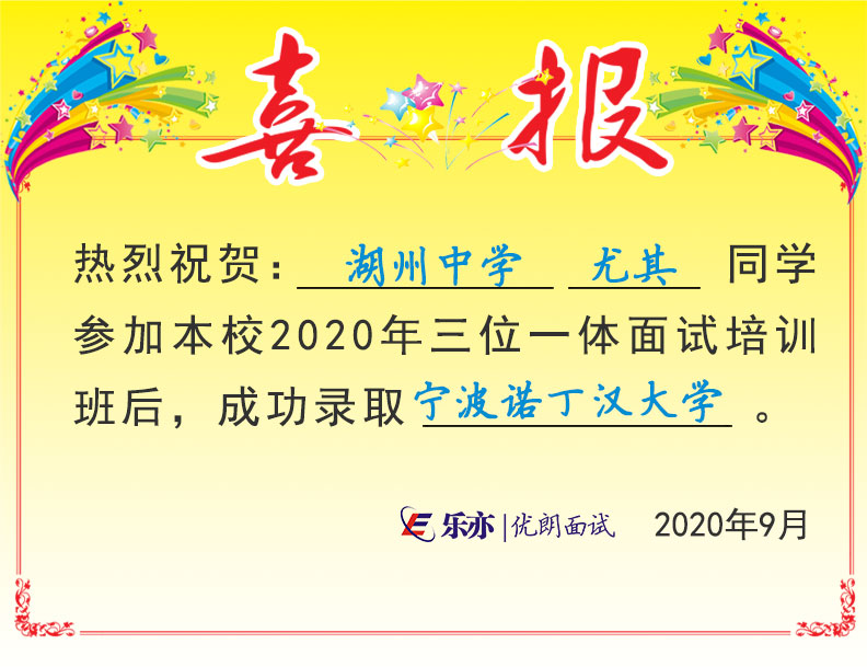 2020喜讯:湖州中学尤其同学成功录取宁波诺丁汉大学 发布时间:2020-08-31 14:37:47 阅读量: 欢迎考生及家长扫码咨询,了解三位一体面试更多内容 咨询微信:swytms 三位一体公众号:sanweiyiti_org