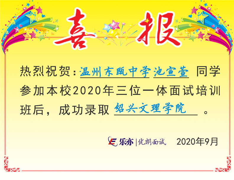 2020喜讯:温州东瓯中学池宣萱同学成功录取绍兴文理学院 发布时间:2020-08-31 16:16:57 阅读量: 欢迎考生及家长扫码咨询,了解三位一体面试更多内容 咨询微信:swytms 三位一体公众号:sanweiyiti_org