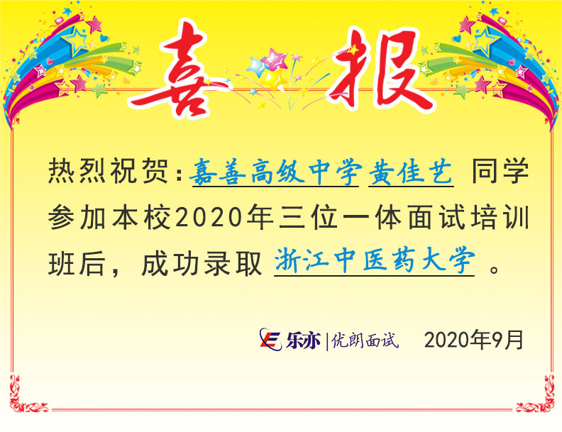 2020喜讯:嘉善高级中学黄佳艺同学成功录取浙江中医药大学 发布时间:2020-08-31 16:32:05 阅读量: 欢迎考生及家长扫码咨询,了解三位一体面试更多内容 咨询微信:swytms 三位一体公众号:sanweiyiti_org