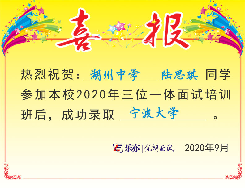 2020喜讯:湖州中学陆思琪同学成功录取宁波大学 发布时间:2020-08-31 16:34:23 阅读量: 欢迎考生及家长扫码咨询,了解三位一体面试更多内容 咨询微信:swytms 三位一体公众号:sanweiyiti_org