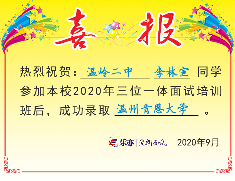 2020喜讯:温岭二中李林宣同学成功温州肯恩大学 发布时间:2020-09-01 17:15:55 阅读量: 欢迎考生及家长扫码咨询,了解三位一体面试更多内容 咨询微信:swytms 三位一体公众号:sanweiyiti_org