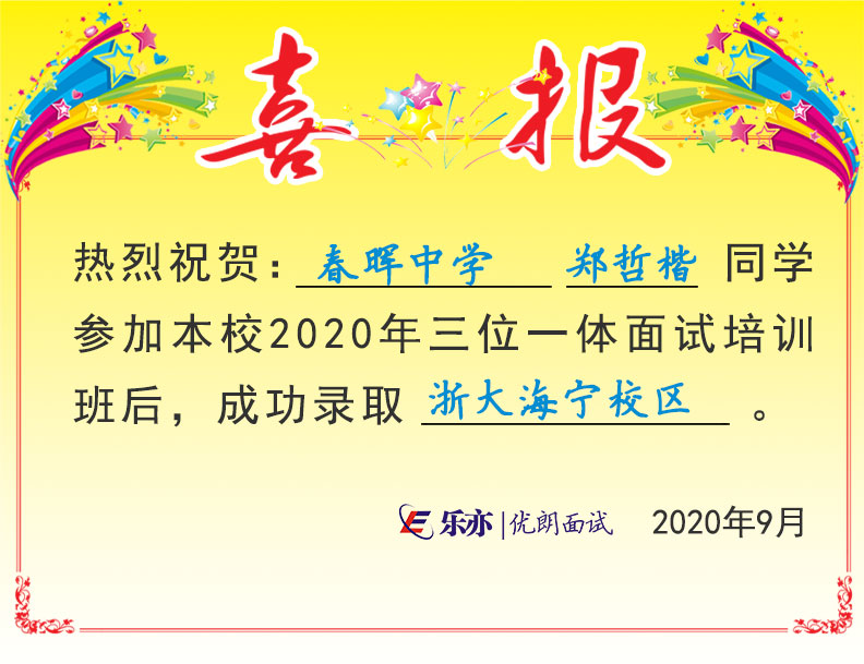 2020喜讯:春晖中学郑哲楷同学成功录取浙大海宁校区 发布时间:2020-09-01 17:18:37 阅读量: 欢迎考生及家长扫码咨询,了解三位一体面试更多内容 咨询微信:swytms 三位一体公众号:sanweiyiti_org