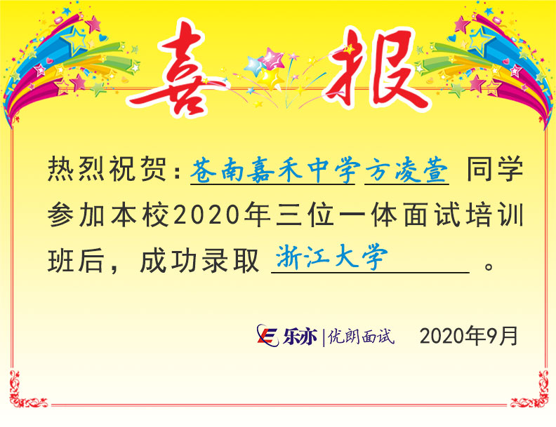 2020喜讯:苍南嘉禾中学方凌萱同学成功录取浙江大学 发布时间:2020-09-01 17:21:00 阅读量: 欢迎考生及家长扫码咨询,了解三位一体面试更多内容 咨询微信:swytms 三位一体公众号:sanweiyiti_org
