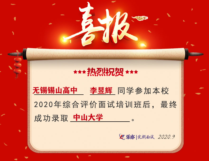 2020喜讯:无锡锡山高级中学李昱辉同学成功录取中山大学
