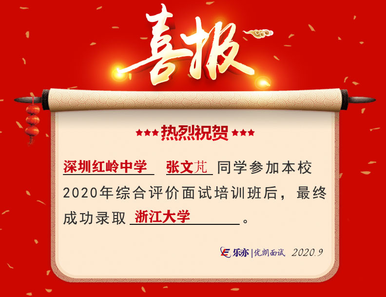2020喜讯:深圳红岭中学张文芃同学成功录取浙江大学