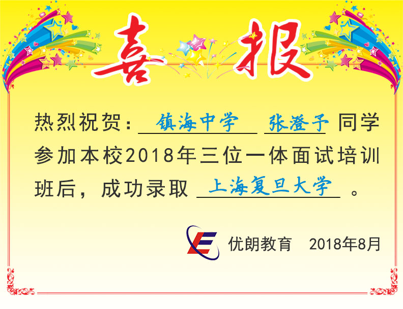 喜讯:镇海中学张澄予同学成功录取上海复旦大学 发布时间:2018-07-30 10:21:38 阅读量: 欢迎考生及家长扫码咨询,了解三位一体面试更多内容 咨询微信:swytms 三位一体公众号:sanweiyiti_org
