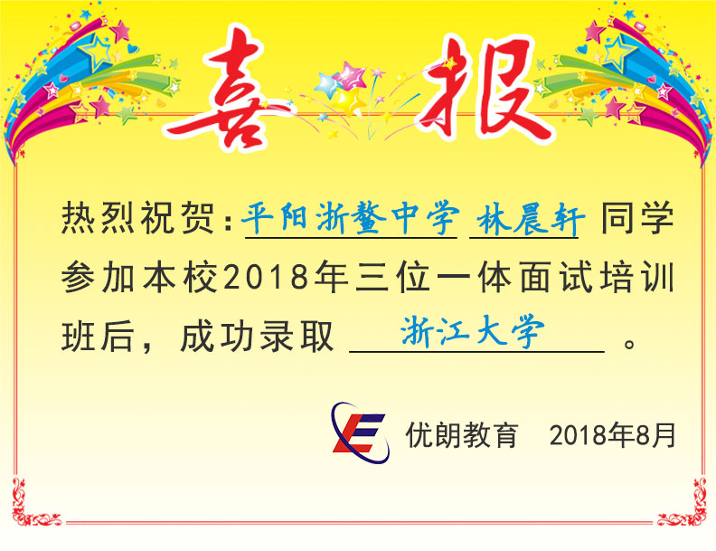喜讯:平阳浙鳌中学林晨轩同学成功录取浙江大学 发布时间:2018-07-30 10:26:06 阅读量: 欢迎考生及家长扫码咨询,了解三位一体面试更多内容 咨询微信:swytms 三位一体公众号:sanweiyiti_org