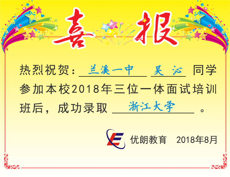 喜讯:兰溪一中吴沁同学成功录取浙江大学 发布时间:2018-07-31 11:44:28 阅读量: 欢迎考生及家长扫码咨询,了解三位一体面试更多内容 咨询微信:swytms 三位一体公众号:sanweiyiti_org