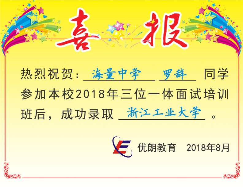 喜讯:海量中学罗辞同学成功录取浙江工业大学 发布时间:2018-08-01 11:33:35 阅读量: 欢迎考生及家长扫码咨询,了解三位一体面试更多内容 咨询微信:swytms 三位一体公众号:sanweiyiti_org
