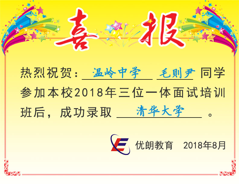 喜讯:温岭中学毛则尹同学成功录取清华大学 发布时间:2018-08-03 10:33:36 阅读量: 欢迎考生及家长扫码咨询,了解三位一体面试更多内容 咨询微信:swytms 三位一体公众号:sanweiyiti_org