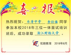 喜讯:温州乐清中学李孙强同学成功录取浙江财经大学