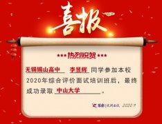 2020喜讯:无锡锡山高级中学李昱辉同学成功录取中山大