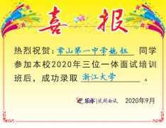 2020喜讯:常山第一中学姚钰同学成功录取浙江大学