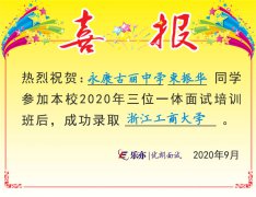 2020喜讯:永康古丽中学束振华同学成功录取浙江工商大