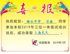 2019喜讯:缙云中学吕诺同学成功录取上海交大