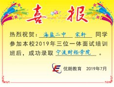 2019喜讯:海盐第二中学宋轩同学成功录取宁波财经学院