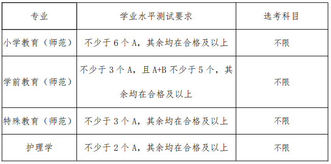 小学教育(师范)、学前教育(师范)、特殊教育(师范)、护理学专业综合成绩按“学业水平测试成绩(折算成满分100分)×10%+综合素质测试成绩(折算成满分100分)×30%+高考文化成绩(折算成满分100分)×60%”计算形成,其中学业水平测试A等计10分,B等计5分,C等计2分,D等不计分。
