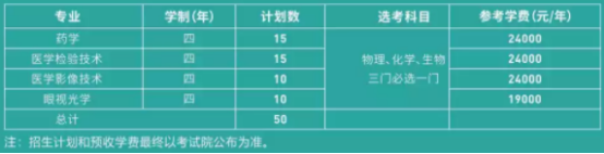 从第一届2016年三位一体招生到2019年,温州医科大学仁济学院的三位一体招生计划由40人上涨至50人,总计划数上并没有太大的增加。三位一体招生专业均设置为医学、药学专业,除摒弃了16年设有的护理学专业外,近两年在专业设置上的差别不大,仅以2019年的三一招生计划做参考,见下图。2020年招生计划总数预测将继续维持50个,且各专业选考科目也会设置在物理、化学、生物三门中需选择一门,总体来看是偏理科的专业要求。