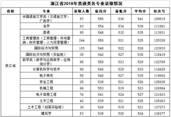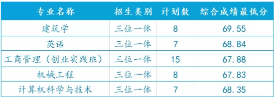 几乎所有的学校在三位一体录取分数上都是逐年递增的,温州大学瓯江学院三位一体录取综合成绩最低分提高了5分左右。而2018年三位一体各专业录取高考分数并未公布,下图仅为普通类录取情况,专业录取平均分都稳定在520-540分之间,位次号在11000-12600内的考生都可大胆填报,通过三位一体形式录取的分数还会更低。