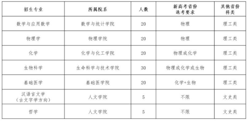 数学与应用数学、物理学、化学、生物科学、基础医学﹑汉语言文学(古文字学方向)﹑哲学。招生计划不超过120人。我校将在北京市﹑河北省﹑山西省﹑吉林省﹑江苏省﹑浙江省﹑安徽省﹑福建省﹑江西省﹑山东省﹑河南省﹑湖北省﹑湖南省﹑广东省﹑广西壮族自治区﹑重庆市﹑四川省﹑陕西省投放强基计划招生专业。