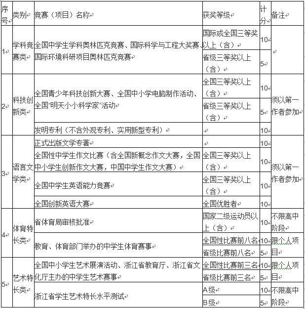 (2)高中阶段在学科竞赛、科技创新、语言、体育、艺术等方面取得突出成就。符合以下条件的考生,可获得素质特长分。同一考生如符合多项素质特长的,可累计,最高为10分。素质特长以考生提供的奖状、证书为主要依据,一般不进行现场展示。