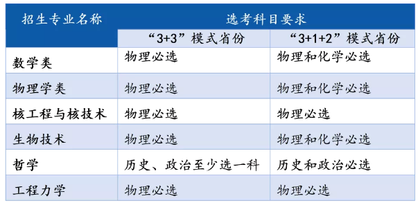 1.招生专业:数学类、物理学类、生物技术、哲学、核工程与核技术、工程力学。在非高考综合改革省份,哲学专业招收文科生,其他专业招收理科生。对实行高考综合改革省份的考生,选考科目须满足以下要求: