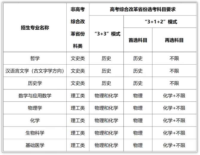 结合学校相关专业优势与办学特色,武汉大学强基计划招生专业为哲学、汉语言文学(古文字学方向)、历史学、数学与应用数学、物理学、化学、生物科学、基础医学。各专业招生科类及选考科目要求如下:
