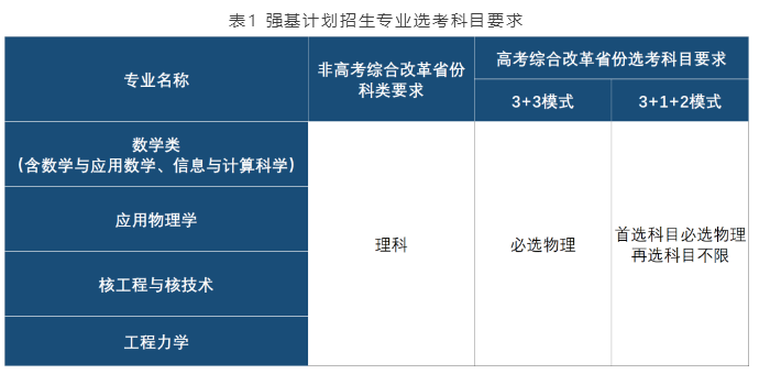我校强基计划的招生专业、非高考综合改革省份科类要求及高考综合改革省份的选考科目要求见下表。