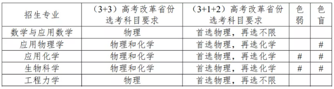 在实行“3+3”新高考改革模式的北京市、天津市、上海市、浙江省、山东省,以及实行“3+1+2”新高考改革模式的河北省、辽宁省、江苏省、福建省、湖南省、广东省、重庆市招收符合所报专业选考科目要求的考生,在安徽省、江西省、河南省、四川省、甘肃省招收理科考生。