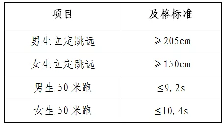 3. 考生需参加由我校组织的体质测试,测试项目可自主选择立定跳远或50米跑。体质测试不受理缓考、补考申请。体质测试及格标准如下:
