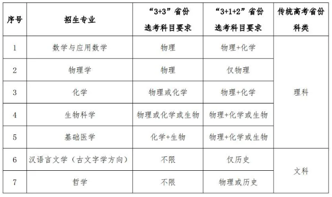 数学与应用数学、物理学、化学、生物科学、基础医学﹑汉语言文学(古文字学方向)﹑哲学。我校将在北京市﹑河北省﹑山西省﹑吉林省﹑江苏省﹑浙江省﹑安徽省﹑福建省﹑江西省﹑山东省﹑河南省﹑湖北省﹑湖南省﹑广东省﹑广西壮族自治区﹑重庆市﹑四川省﹑陕西省投放强基计划招生专业,具体分省分专业招生计划以报名系统内公布为准。