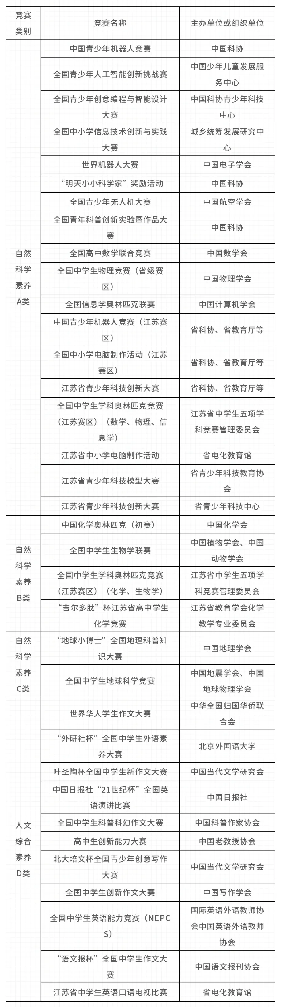 高中阶段获得自然科学素养A类、B类、C类竞赛省级一等奖,得100分;省级二等奖,得70分;省级三等奖,得40分。