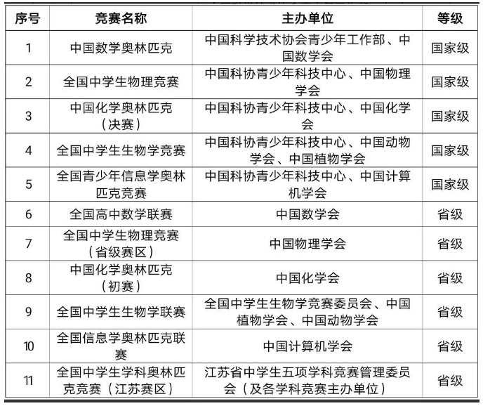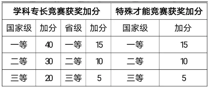 学科专长竞赛获奖加分仅为全国中学生奥林匹克(数学、物理、化学、生物、信息学)竞赛。同一学生同一学科奥林匹克竞赛获奖只计最高奖,不累计加分。