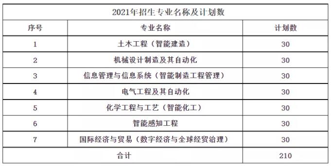 2021年创新实验班总计划数210人。仅限合肥校区一年级新生报考。2021年非高考综合改革省份的文科专业学生不能报考:英语、印度尼西亚语、思想政治教育、法学。特殊类型招生专业学生不能报考:国际经济与贸易(中外合作办学)、法学(高水平运动队)、环境设计、视觉传达设计。