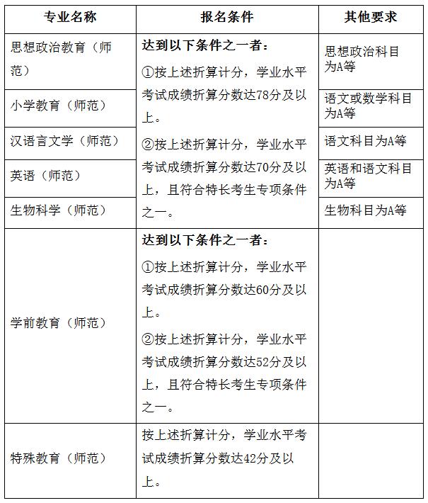 已经参加2018年浙江省普通高校招生考试报名,学业水平考试各科目合格,综合素质评价B等(含)以上(2016届及之前的往届生综合素质评价不低于P等),满足我校对应各专业2018年选考科目要求。学业水平考试(10门)等第折算成绩满分为100分,其中,A等计10分,B等计8分,C等计4分(2016届及之前的往届生学业水平考试C等不计分),D等及以下不计分。(2016届及之前的往届生,通用技术和信息技术两项取高的等级作为技术科目学考成绩等级)。