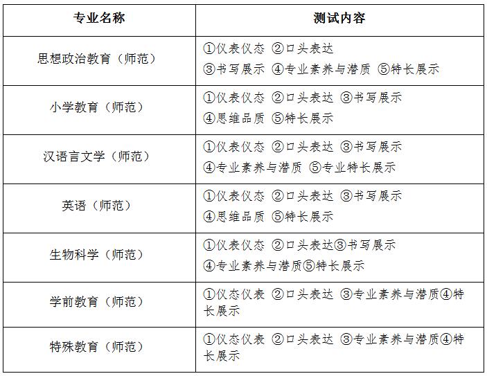 测试分专业采用面试方式进行,面试主要考核考生专业素养、专业潜质和综合素质。具体各专业测试内容如下: