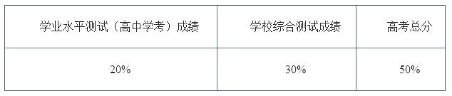 2.综合成绩计算:综合成绩由学业水平测试(高中学考)成绩、学校综合测试成绩、高考成绩三部分组成。综合成绩按“学业水平测试(高中学考)成绩(折算成满分100分)×20%+学校综合测试成绩(折算成满分100分)×30%+高考总分(折算成满分100分)×50%”计算形成。