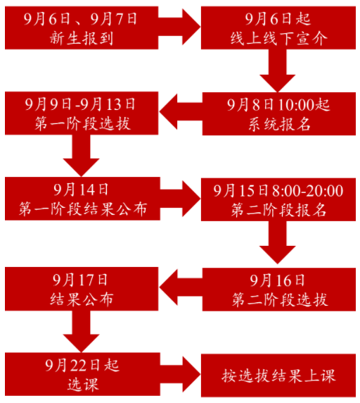 选拔分两阶段进行,流程可参考下图,最终结果将于9月17日前公布,同学们可以登录系统查看已申请项目审核状态。