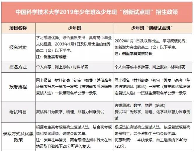 中国科学技术大学2019年少年班、少年班“创新试点班”招生政策
