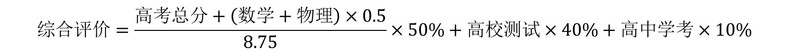其中:我校测试满分折算为100分;高中学业水平考试10个科目,各科所获等级按A=10分、B=9分、C=8分、D=6分、E=0分折算,满分为100分,新高考改革前的非应届毕业生的“技术”科目成绩,取信息技术、通用技术两个科目成绩的平均值。3、我校按入围资格生综合评价成绩由高到低确定录取名单,依据“分数优先”的原则结合专业志愿确定录取专业。考生综合评价成绩相同时,按单项(以我校综合测试成绩、加权后高考总分、高中学业水平考试换算成绩为序)分数从高到低确定先后顺序。综合评价成绩达不到所填报专业志愿的考生,应服从专业调剂,否则不予录取。
