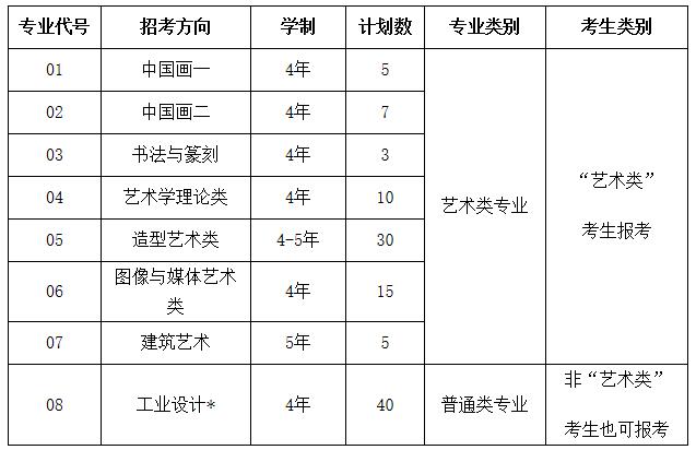 中国画(中国画一、中国画二)、书法学(书法与篆刻)、艺术学理论类、美术学类(造型艺术类)、戏剧与影视学类(图像与媒体艺术类)、建筑学(建筑艺术)专业在艺术类第一批提前录取。