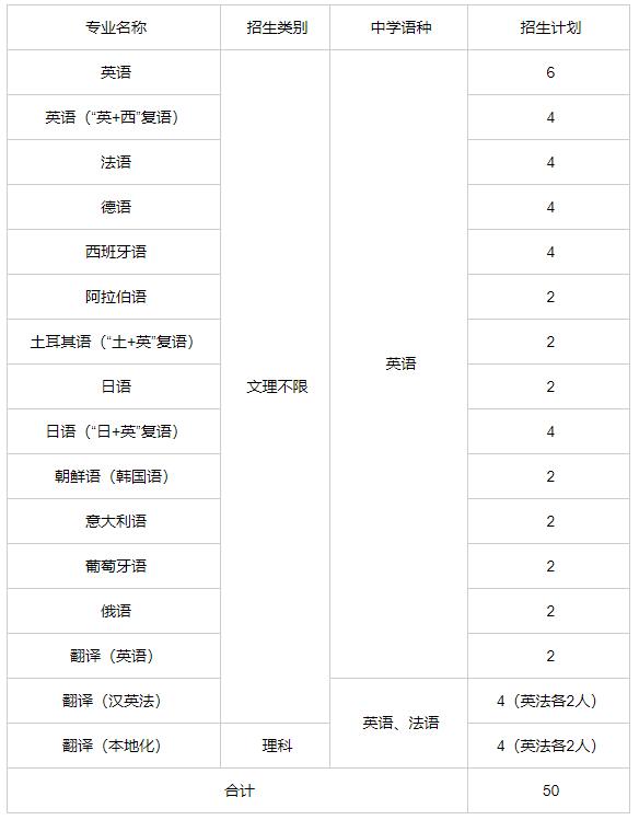 考试内容:校考成绩满分为300分,包括外语笔试(150分)、语文笔试(100分)和面试(50分)。其中,外语和语文笔试两科一张卷,英语类考生面试语种为英语,法语类考生面试语种为法语和英语。具体考试安排请关注报名系统,不再另行通知。